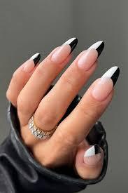 Tak ada yang lebih netral daripada kombinasi hitam dan putih, tetapi dengan bentuk almond yang panjang dan lengkungan dramatis di ujung kuku, French manicure hitam putih terbalik ini tetap memberikan kesan maksimal. Kontras klasik antara hitam dan putih membuat desain terlihat tegas dan chic, sementara bentuk almond menambah sentuhan elegan yang feminin. Desain ini membuktikan bahwa manikur netral pun bisa sangat memukau jika dikombinasikan dengan detail yang tepat.